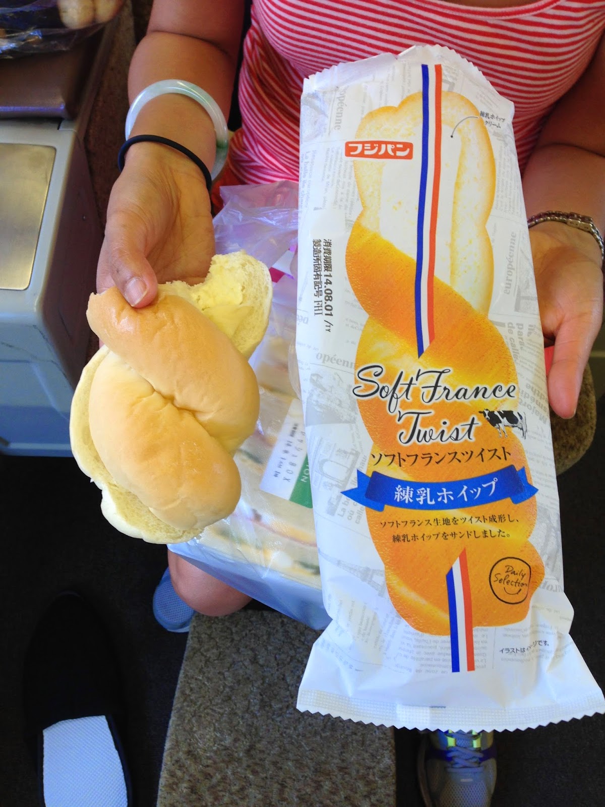 We're taken to the station in the Ryokan car, and along the way, I spied a grocery store to get some food for our train ride. Connie and the kids go, while I watch our luggage at the station (we have a half hour). she finds a France Pan - like imitation which wasn't bad at all!